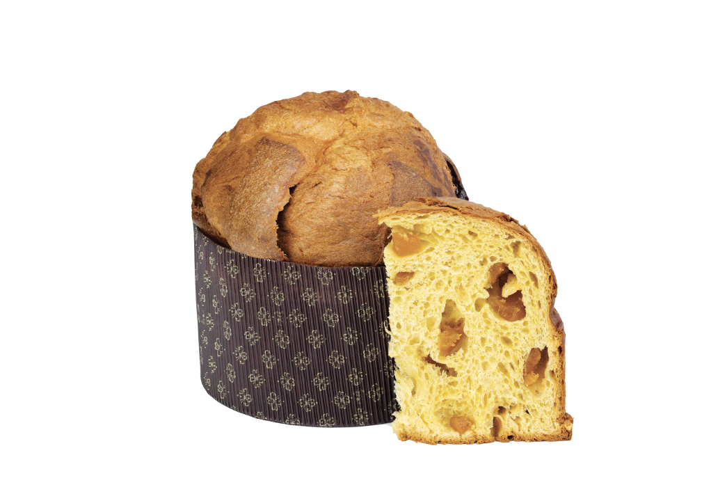 Prodotto dolciario da forno artigianale a lievitazione naturale. Panettone farcito con albicocca pellecchiella del Vesuvio candito, senza uvetta e scorze di agrumi canditi.