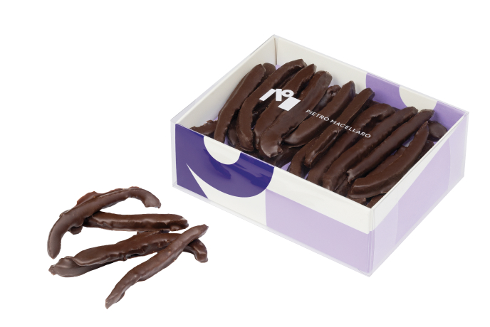 Filetti di arancia candita ricoperta in cioccolato fondente 70% di cacao.