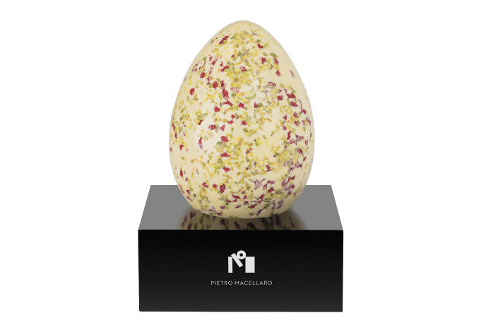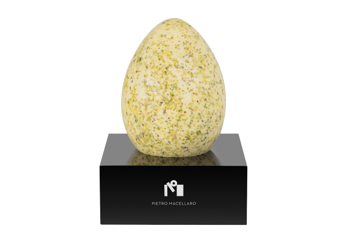 Uovo in cioccolato bianco con burro di cacao integrale Cuzco Perù con granella di pistacchio.