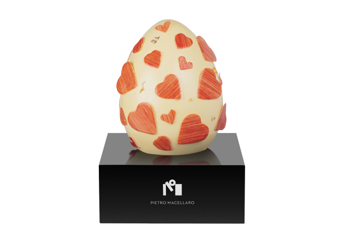 Uovo di cioccolato bianco 45% di cacao Maracaibo con cuori rossi.