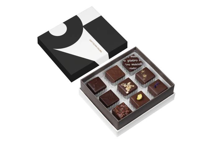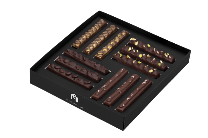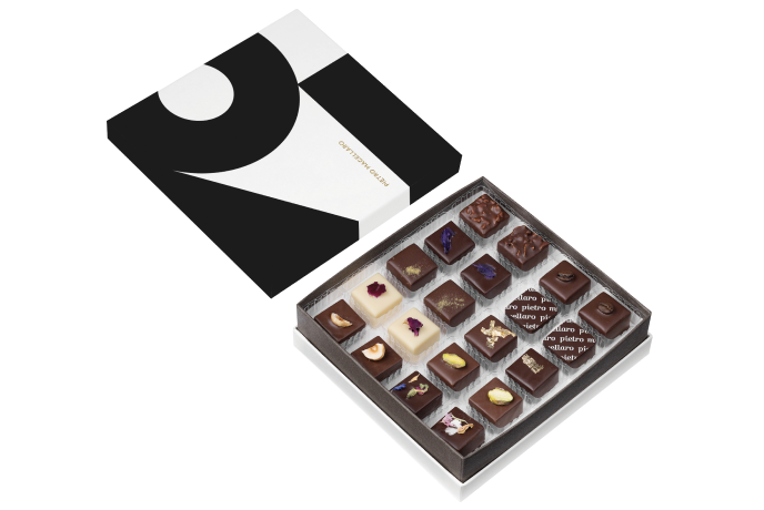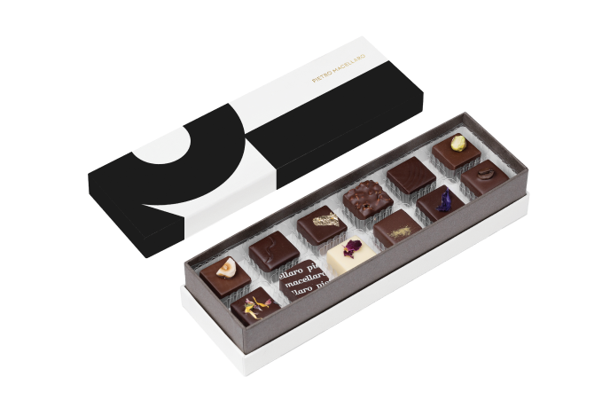 Pralina piura violetta, pralina cognac, pralina aceto balsamico, pralina piura buffalo cream, pralina pistacchio crunch, cremino pistacchio, pralina all’olio extravergine di oliva, pralina origano selvatico e limone, pralina caffè, cremino alla nocciola, pralina noci di Sorrento miele e fave di tonka, pralina roseline.