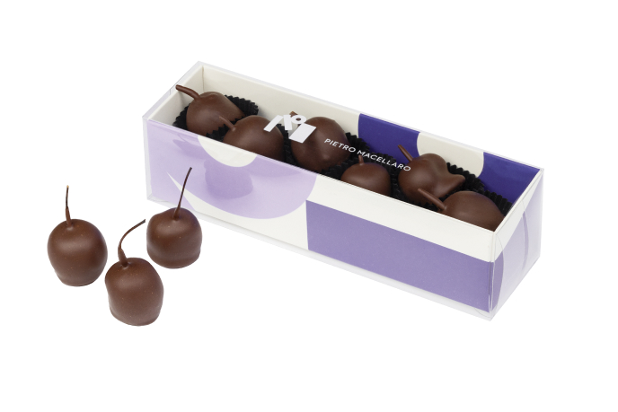 Ciliegia coltivata in casa macerata in cognac francese per almeno 3 mesi, ricoperta in cioccolato fondente 70% di cacao Piura Perù.