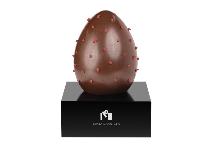 Uovo in cioccolato fondente Cuzco 75% di cacao con briciole di lamponi disidratati.