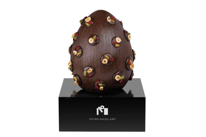 Uovo in cioccolato fondente 70% di cacao Piura Perù ricoperto con cioccolatini mendicanti alla frutta secca.