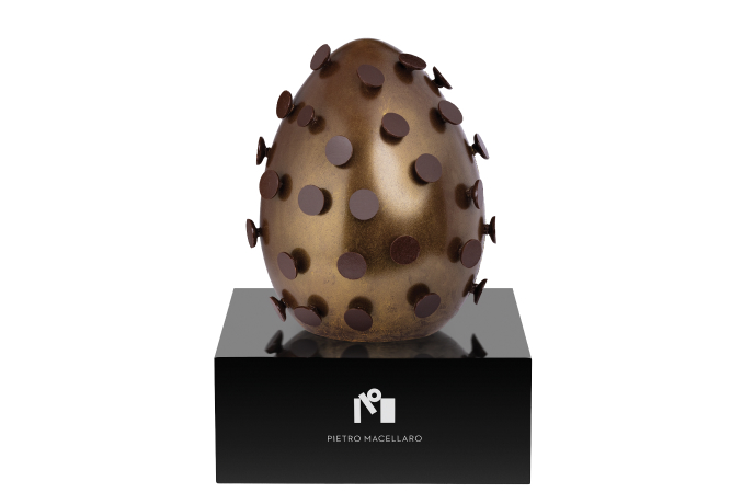 Uovo in cioccolato fondente 70% di cacao San Martin Perù ricoperto in gocce di cioccolato fondente.