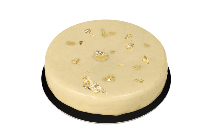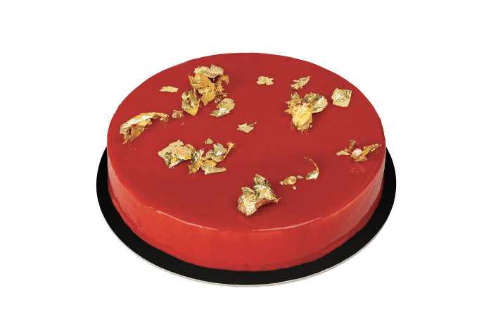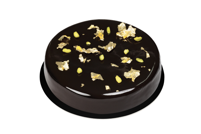 Croccantino di mandorle e pistacchi, mousse leggera al mascarpone e bavarese al pistacchio racchiusi da una glassa a specchio al cacao.