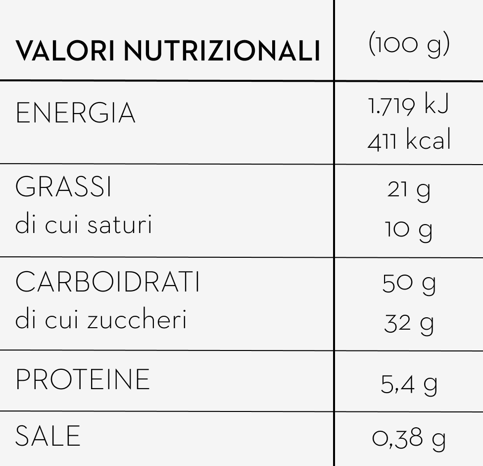 ingredienti farina di FRUMENTO tipo 00, burro (LATTE), limone a cubetti 18% (limone, zucchero, sciroppo di glucosio), tuorlo d’UOVO pastorizzato, glassa (zucchero, farina di MANDORLE, farina di NOCCIOLE tostate, UOVA di gallina albume, armelline amare sgusciate, farina di mais bramata, cacao in polvere (cacao in polvere, correttori di acidità (carbonato di potassio, acido citrico), fecola di patate), zucchero, LATTE fresco intero pastorizzato, lievito madre naturale (FRUMENTO, acqua), miele, pasta di limone (scorza di limone, sciroppo di glucosio-fruttosio, zucchero], MANDORLE, farina di FRUMENTO integrale, origano secco macinato (0,43%), sale iodato, Baccelli di vaniglia Bourbon. Può contenere: ARACHIDI, FRUTTA A GUSCIO (PISTACCHI), SESAMO, SOIA