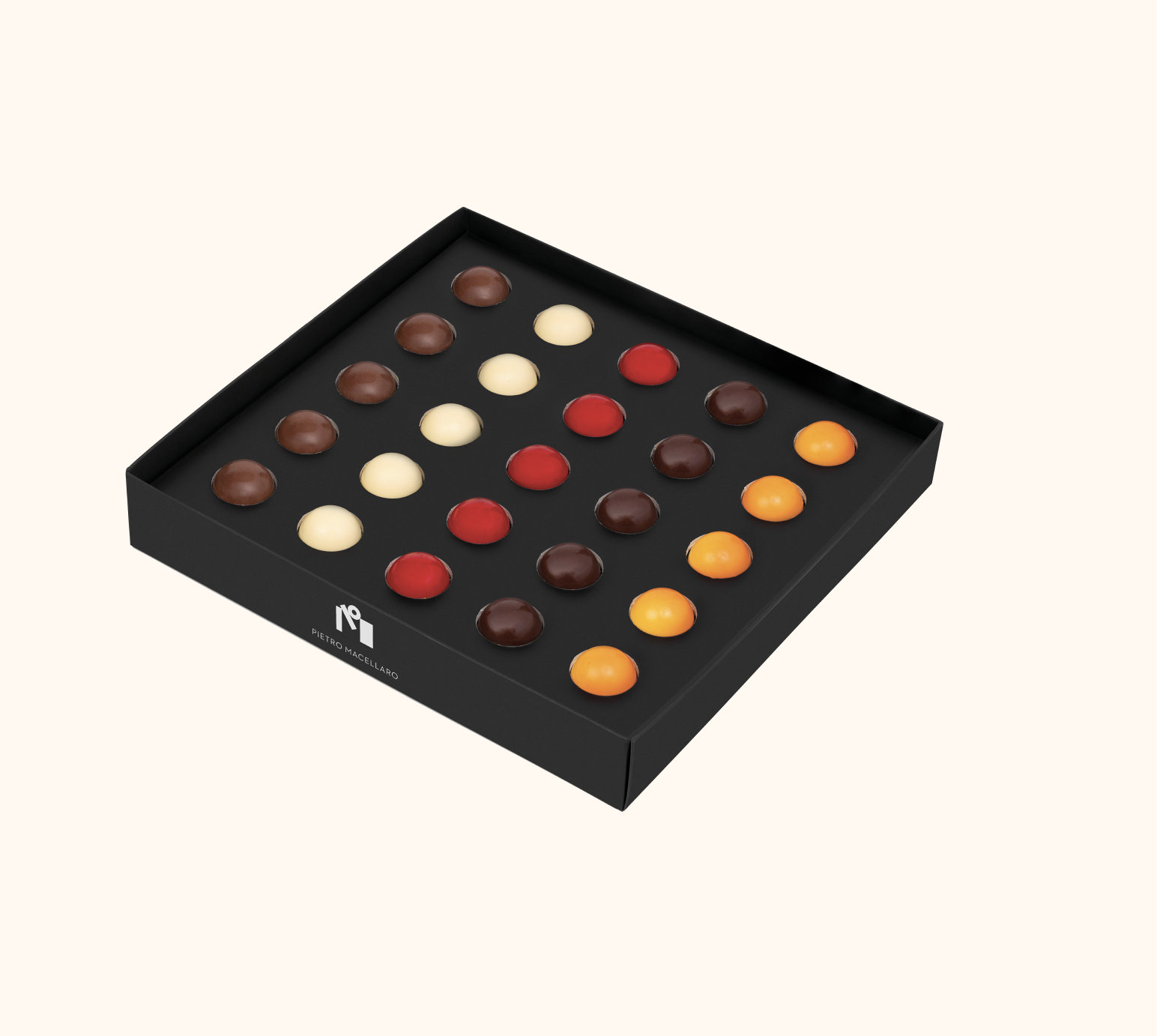 Pralina piura violetta, pralina cognac, pralina aceto balsamico, pralina piura buffalo cream, pralina pistacchio crunch, cremino pistacchio, pralina all’olio extravergine di oliva, pralina origano selvatico e limone, pralina caffè, cremino alla nocciola, pralina noci di Sorrento miele e fave di tonka, pralina roseline.
