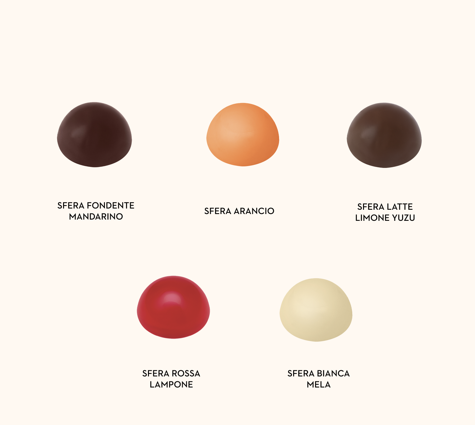Sfera fondente mandarino, sfera arancio, sfera latte limone yuzu, sfera rossa lampone, sfera bianca mela.