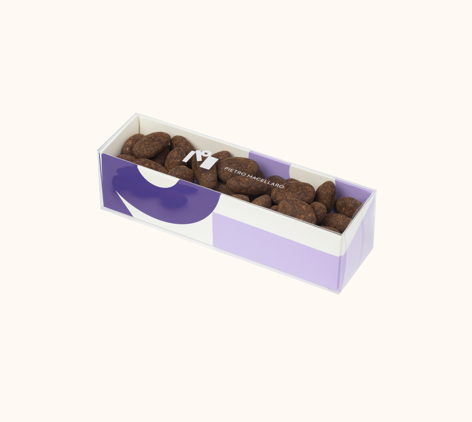 ingredienti MANDORLE (42%), cioccolato fondente (cacao min. 72%) (42%) [pasta di cacao, zucchero, cacao magro in polvere, lecitina di SOIA, aroma naturale di vaniglia], zucchero, colorante oro perlato [e555, e171, e172], sale iodato di vaniglia Bourbon.