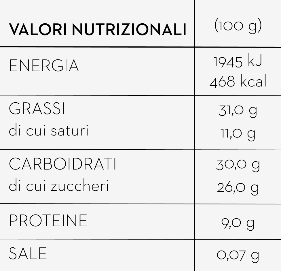 ingredienti PANNA fresca pastorizzata, cioccolato di copertura al latte (cacao min. 42%) [zucchero, burro di cacao, LATTE intero in polvere, pasta di cacao, LATTE scremato in polvere, emulsionante [lecitina di SOIA], aroma naturale di vaniglia], zucchero, sciroppo di glucosio, BURRO, sale fino, vaniglia Bourbon del Madagascar in polvere, colorante oro perlato [e555, e171, e172].