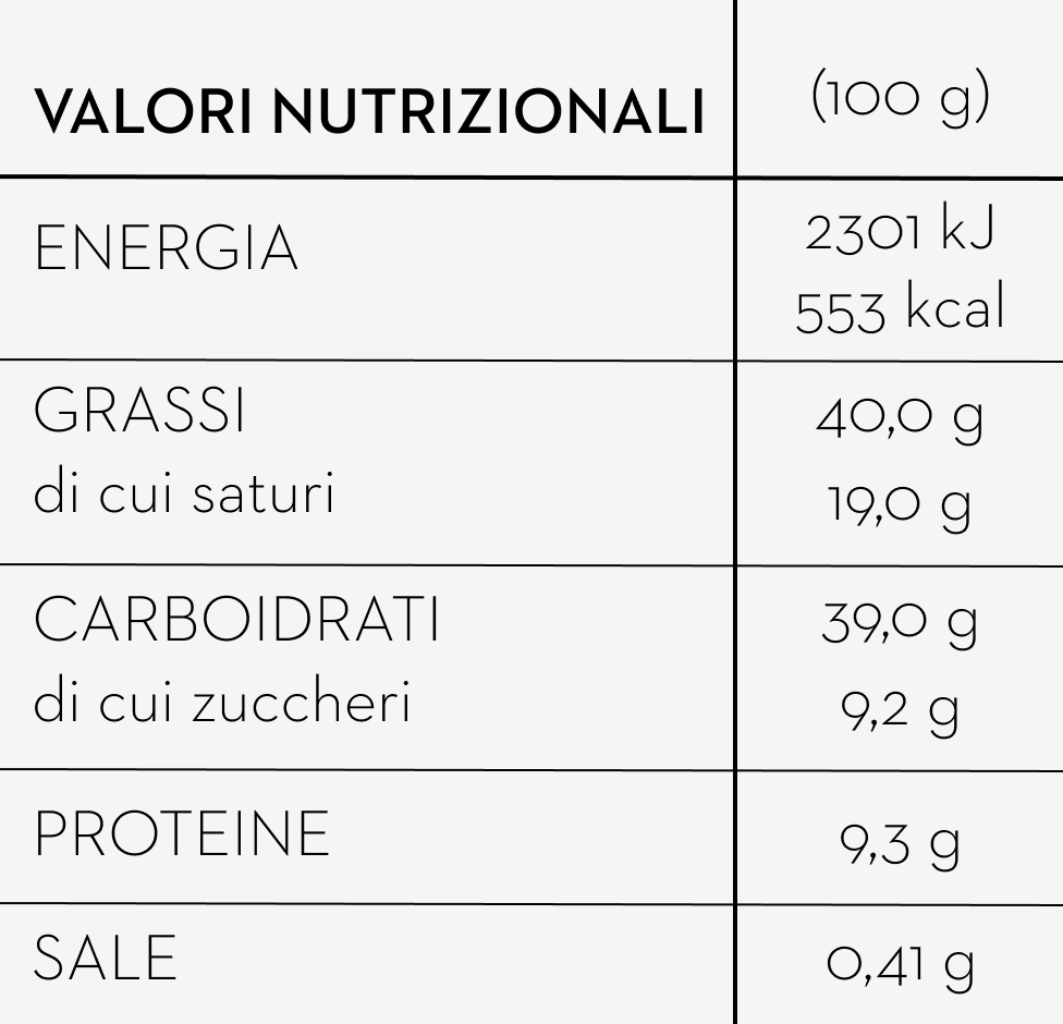 ingredienti farina di FRUMENTO tipo 00, BURRO, PISTACCHIO verde di Bronte d.o.p. sgusciato (17%), cioccolato fondente di copertura biologico ed equosolidale (70% cacao min.) (12%) [fave di cacao del Perù, zucchero di canna, burro di cacao, emulsionante [lecitina di girasole]], zucchero, pasta di PISTACCHIO verde di Bronte dop (2%), baccelli di vaniglia Bourbon, sale iodato.